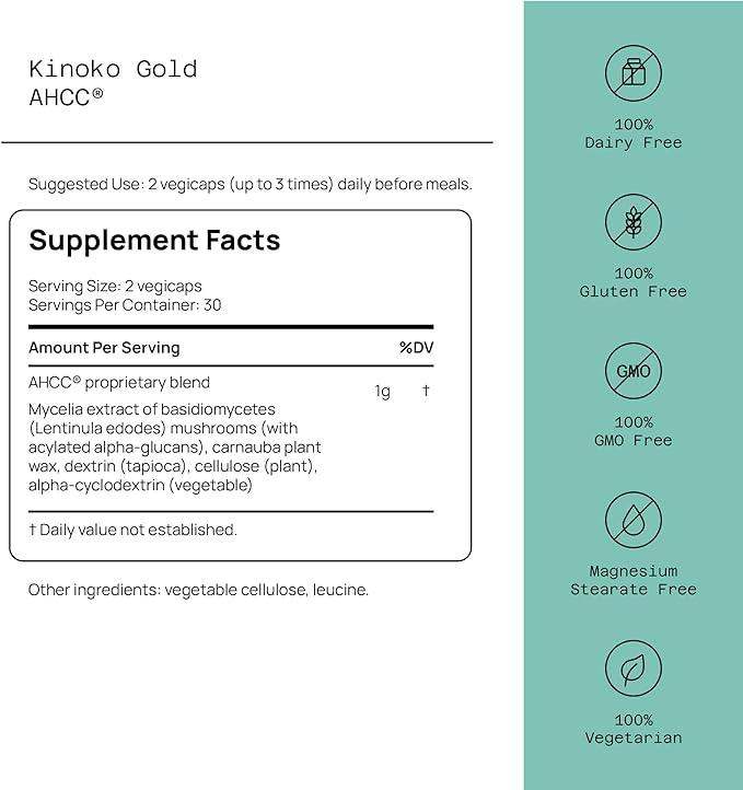 Kinoko Gold AHCC má 500 mg AHCC v každé tobolce, která podporuje jaterní funkce a imunitní zdraví a zvyšuje produkci cytokinů a přirozenou aktivitu zabíjených buněk.