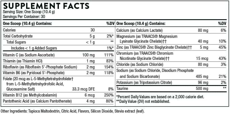 Η βιταμίνη C (ως ασκορβικό νάτριο), η θειαμίνη (όπως η θειαμίνη ΗΟΙ), η ριβοφλαβίνη (ως ριβοφλαβίνη 5'-φωσφορική νάτριο), η βιταμίνη Β6 (ως πυριοξικό 5'-φωσφορικό), το φολικό άλας (20 mcG ως L-5-μεθυλοτεδροφυλικό -5-μεθυλοτετραϋδροφολικό οξύ, άλας γλυκοζαμίνης), βιταμίνη Β12 (ως μεθυλοβαλαμίνη), παντοθενικό οξύ (ως παντοθενικό ασβέστιο), ασβέστιο (γαλακτικό ασβέστιο), μαγνήσιο (όπως το τρανάσκο ζελικό λυστοναϊκά) Χηλικό), χρωμίου (όπως το χηλικό χλωριούχο νικο-νικοτινικό χλωρίδιο Traacs®), το χλωριούχο (ως χλωριούχο νάτριο), το νάτριο (ως χλωριούχο νάτριο και φωσφορικό disodium), κάλιο (ως κιτρικό κάλιο), d-ριβόζη, ταπιόδια μαλτοδεξτρίνη, φλόγα, φλόγες. Φωσφορικό Dicalcium, διοξείδιο του πυριτίου, εκχύλισμα Stevia (φύλλο) (rebaudioside 95%).