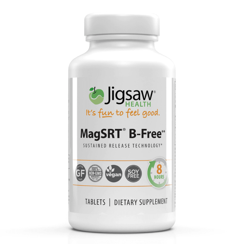 Magnesio de Jigsaw Health con SRT (B-F-Free) ofrece una fórmula única de magnesio con tecnología de liberación sostenida (SRT) en una botella de 240 tabletas.