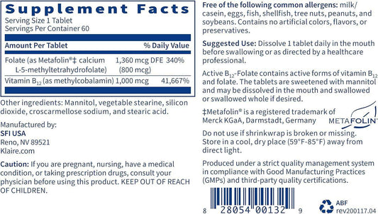 246 BeoordelingenLeverancier:Klaire LabsActief B12/B -12 Folaat, 60 tabletten - Klaire Labs (SFI Health)