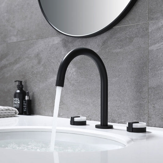 144 BeoordelingenLeverancier:Fino StoneFino Stone op een plank gemonteerde zwarte gebogen kraan met dubbele marmeren handgrepen