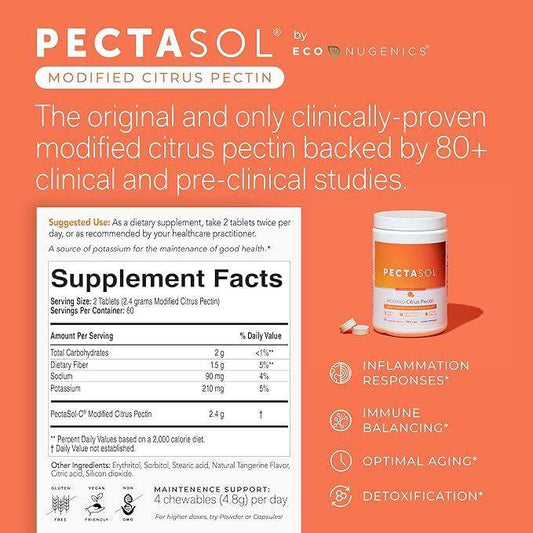 144 BeoordelingenLeverancier:EcoNugenicsPectasol -C (gemodificeerde citrus pectine) mandarijninfusie - 120 kauwtabletten - Econugenics